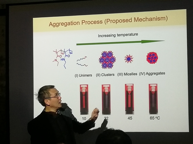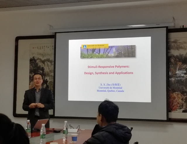 报告会上,朱晓夏教授首先介绍了蒙特利尔的风土人情,随后就多重响应性聚合物的设计、合成与应用进行了讲解。多重响应性聚合物为聚合物溶液的聚集和流变性能的研究提供了物理模型,具有生物医学和工业方面的应用价值。朱晓夏教授课题组设计合成了多步响应和多重响应的共聚物,有些共聚物的溶液表现了从清变浊,又变清,最后再变浊的复杂变化过程。通过研究这种复杂的热响应行为,绘制出了聚合物水溶液的相图,以便于设计制备多重响应性材料。此外,朱晓夏教授从加拿大的人口老龄化问题切入,详细说明了此类多重响应性聚合物材料的一些实际应用。报告期间,朱晓夏教授风趣幽默的语言和细致透彻的讲解,给大家留下了深刻的印象。