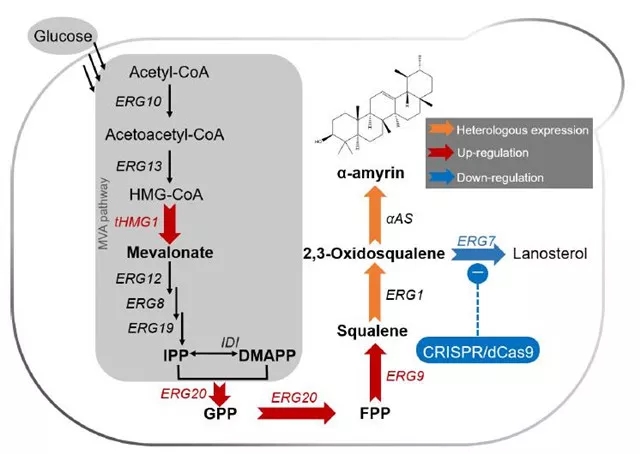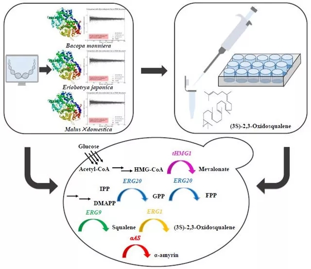 在本研究中,研究人员通过将α-香树脂醇合酶MdOSC1引入酿酒酵母中,同时增加(3S)-2,3-氧化角鲨烯的供应以实现高效生产α-香树脂醇,摇瓶产量达到11.97±0.61mg / L,是之前报道的最高产量的5.8倍。