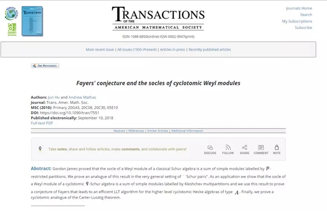 beat365在线唯一官网登录数学与统计学院胡峻教授在国际顶级学术期刊《Transactions of the American Mathematical Society》上发表了题为“Fayers’conjecture and the socle of cyclotomic Weyl modules”的研究论文。该论文研究了分圆Schur代数的分圆Weyl模的基座,证明了这些基座中的单模全部都是由Kleshchev多重剖分来参数化,并在此基础上证明了英国代数学家Fayers提出的关于Fock空间典范基的一个猜想。