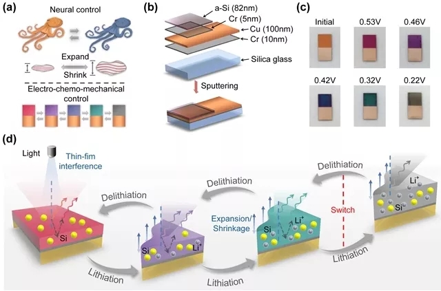 大自然中有多种能够自适应变色伪装的生物,以章鱼为例,当外界环境发生改变时,章鱼能够通过主动调控皮肤细胞中蛋白质的体积来改变光在不同界面的相位差,从而实现皮肤变色。方岱宁课题组通过设计具有稳定可逆膨胀的硅膜电极,模仿章鱼皮肤变色机理,巧妙地利用嵌锂电位(<1 V),精确控制锂离子在硅薄膜中的脱嵌行为,实现硅膜的高精度体积变化调控,改变硅膜结构对光线反射产生干涉消光条件,获得一系列绚丽色彩。值得一提的是,调控硅薄膜中的嵌锂程度,可以实现关闭或开启光线干扰作用,器件可以实现彩色至银色的切换功能。