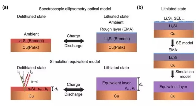 该团队通过实验和理论模拟进一步研究了该仿生变色器件中的电化学力学耦合变色机理。采用椭偏仪测试了其不同锂化程度下的纳米硅薄膜的光学常数(折射率和消光系数),以及相对应的纳米硅薄膜的厚度,验证了锂化纳米硅薄膜的化学演化过程。通过建立光学理论模型,预测出不同嵌锂程度下的器件反射率,其预测结果和实验测试吻合,进一步验证了该仿生变色器件的调控机理。