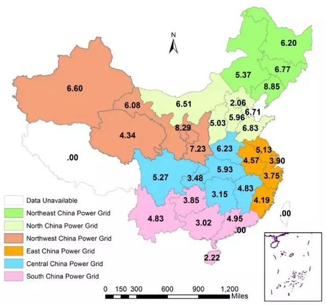 本研究首先测算了中国六大区域电网内所有煤电机组的燃料消耗率,发现2014年中国煤电机组的燃料消耗率位于273.91 gce/kWh和348.38 gce/kWh之间。同时,无论是在省级电网层面、区域电网层面和全国层面,同一电力平衡区域内煤电机组的燃料消耗率均存在着不同程度的差异,说明了电力系统的调度机制改革存在着一定的节能空间。
