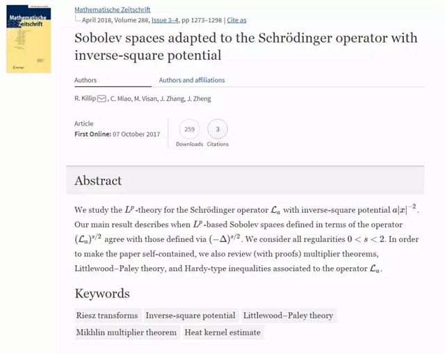 日前,beat365在线唯一官网登录数学与统计学院张军勇特别研究员与及其合作者在国际数学顶级学术期刊《Mathematische Zeitschrift》上发表了题为“Sobolev spaces adapted to the Schrödinger operator with inverse-square potential”的研究论文。该论文通过建立含反平方位势薛定谔算子所对应的Littlewood-Paley 理论、乘子定理、Hardy 不等式等调和分析工具,证明了含反平方位势薛定谔算子在L^p框架下的Sobolev空间与经典的Sobolev空间的等价性。