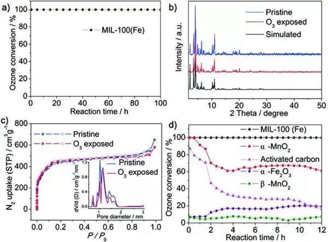 MIL-100(Fe)物理性能表征及对臭氧转化率(a)MIL-100(Fe)的臭氧转化率。b)模拟的、合成的和暴露于臭氧的MIL-100(Fe)的粉末XRD图案。c)在暴露于臭氧之前和之后,MIL-100(Fe)的N2吸附等温线。插图:MIL-100(Fe)的孔径分布。d)分别对MIL-100(Fe)、α-MnO2、活性炭、α-Fe2O3和β-MnO2进行臭氧转化。条件:用0.27g石英砂稀释的0.03g催化剂,C(O₃)="45ppm,流速=1000mL·min^-1,RH=45%,室温。)