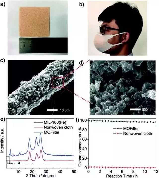 MOFilter的制作及其应用测试(a,b)MOFilter的照片和包含MOFilter的口罩。c)MOFilter的SEM图像。d)(c)中方框的放大图像。e)模拟MIL-100(Fe),无纺布和MOFilter的XRD图案。f)MOFilter上的臭氧去除,入口臭氧浓度为200ppb,室温下RH为45%。)
