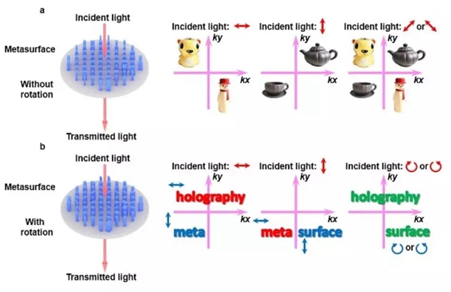 伴随着微纳加工工艺的进步,超颖表面在全息领域展现出了独特的应用前景。相比于基于空间光调制器的传统全息方法,基于超颖表面产生的全息再现像的分辨率和再现质量得到了极大地提高,可以克服传统全息所面临的诸如带宽窄、视场角小、存在多级衍射级次串扰、孪生像等挑战。同时,基于超颖表面的全息方法能够克服自然界材料(如空间光调制器、光刻胶)对偏振不敏感,仅能实现标量全息的限制。