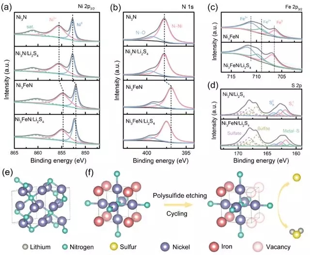 类似于金属催化剂设计的合金化策略,该团队在单金属化合物中引入外在金属,活化了原来的惰性相化合物,从而促进多硫化物的表面反应动力学。以六方氮化镍(Ni₃N)作为概念验证,其对多硫化物的催化活性较差。在引入铁元素后,Ni₃N转变为高活性的立方镍铁氮化物(Ni₃FeN)。在Ni₃FeN中,处于立方结构顶角处的较高正电性的铁(与镍相比)倾向于通过多硫化物的刻蚀过程浸出,从而在镍位点的周围留下大量空位缺陷,极大地提高了Ni₃N的催化活性。