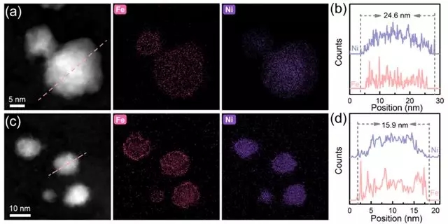 (a,b)循环前和(c,d)循环后Ni₃FeN-G的HAADF-STEM图像和相应的元素分布