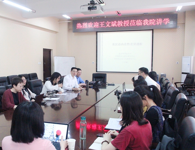 5月14日下午,北京外国语大学中国外语与教育研究中心王文斌教授受邀莅临beat365在线唯一官网登录外国语学院,并于中心教学楼515会议室作了题为“英汉语内在性差异透析”的学术报告。外国语学院院长李京廉教授主持了本次报告会,副院长姜爱红教授、英语专业教研室、研究生英语教研室的教师和英语专业的本科生、研究生参加了此次讲座。