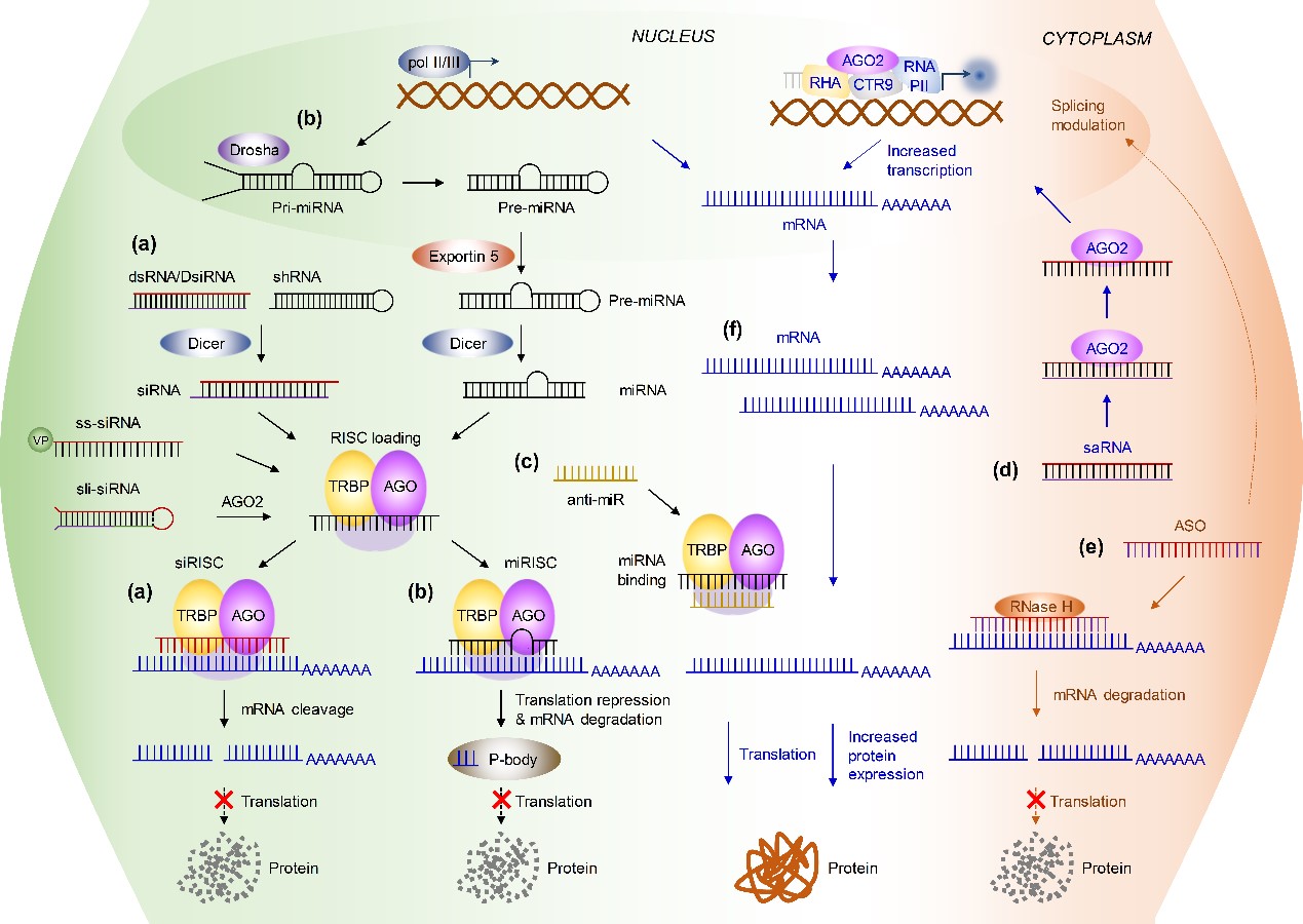 (a)小干扰RNA(siRNA)与(b)微小RNA(miRNA)的作用通路;(c)miRNA拮抗核酸作用机制;(d)小激活RNA(saRNA)的工作模式;(e)反义核酸(ASO)作用方式;(f)信使RNA(mRNA)疗法的特点