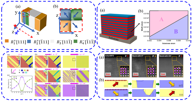铁电材料方面成果为:1)构建了表面电荷诱导极化强度翻转的相场模拟,揭示了可逆极化翻转归因于其水溶液中BiFeO3薄膜表面的原子化学键的重构,导致表面电荷聚集,BiFeO3薄膜表面上的负(正)电荷的累积可以导致从向下(上)到向上(下)状态的极化强度翻转,同时,模拟预测了表面电荷也可诱导铁电涡旋畴结构的产生。2)构建了宽温变电卡效应的相场模型,在铁电超晶格中,通过调节层间失配应变和衬底错配应变之间的平衡,扩大电卡效应的温度范围到281 K。3)构建了压电效应相场模型,锆钛酸铅如果远离准同型相界,压电常数的提高主要依赖于畴翻转,而靠近准同型相界,其各相之间的自由能差异小,电场容易诱导相变,能够大大提高压电常数。
