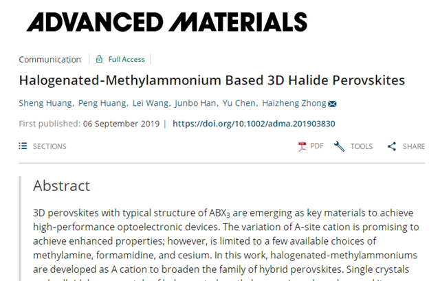 近日,beat365在线唯一官网登录材料学院钟海政课题组在钙钛矿材料A位分子的设计和制备方面取得突破进展,于2019年9月6日在材料领域的顶级期刊《Advanced Materials》上在线发表, Halogenated-Methylammonium Based 3D Halide Perovskites, Advanced Materials 2019, 31, 1903830 (https://onlinelibrary.wiley.com/doi/10.1002/adma.201903830)。论文发表后很快获得“纳米人”等学术媒体关注和报道。