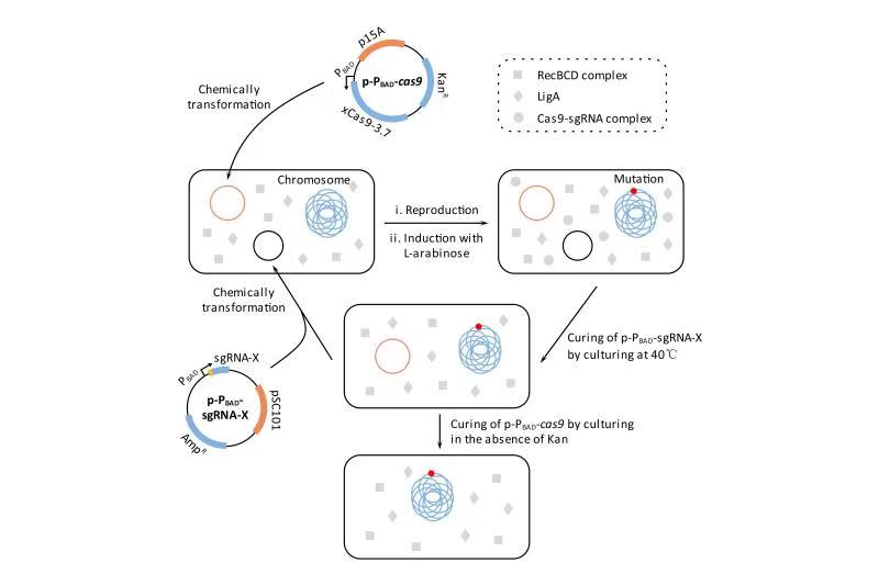 beat365在线唯一官网登录生命学院的霍毅欣教授课题组利用David Liu课题组开发的 xCas9-3.7(SpCas9的进化版突变体)和Jennifer Doudna课题组改造的sgRNA(tracrRNA : crRNA的强化版融合体)构建了一个双质粒严谨诱导型的基因组编辑系统,并将其命名为CNEE。该系统极为简单,其功能组件只有Cas9和sgRNA,没有任何外源的DNA修复蛋白,利用该系统,即使宿主的DNA修复系统效率极低,也能高效率地进行基因组编辑。该课题组将CNEE系统导入大肠杆菌,在宿主A-EJ系统的协助下,实现了高效的基因敲除和长达83 kb的大片段删除(图1)。这种方法不需要编辑模板,可以实现快速迭代的大肠杆菌遗传改造,并且编辑效率不依赖于高转化活性的宿主细胞。由于RecBCD和LigA(或它们的同源基因)在所有的原核生物中都存在,因此理论上CNEE系统适用于任何原核生物的基因组编辑。随后,该课题组在CNEE的基础上构建了一个变异系统,为了方便描述,暂且把该系统称为CNEE-V1。将CNEE-V1导入大肠杆菌,可以在宿主RecA同源重组系统的协助下实现高效精确的基因组编辑,包括序列的删除、插入和替换。CNEE-V1是对CNEE的有效补充;由于RecA(或它的同源基因)在所有的原核生物中都存在,因此理论上CNEE-V1也适用于任何原核生物的基因组编辑。此外,该课题组还证明,将分枝杆菌来源的NHEJ系统引入CNEE可以进一步增强CNEE的性能;同样,将噬菌体来源的λ-Red系统可以进一步增强CNEE-V1的性能。相关成果发表于TOP(顶级)期刊《Applied Microbiology and Biotechnology》,原文链接:https://doi.org/10.1007/s00253-019-10104-w