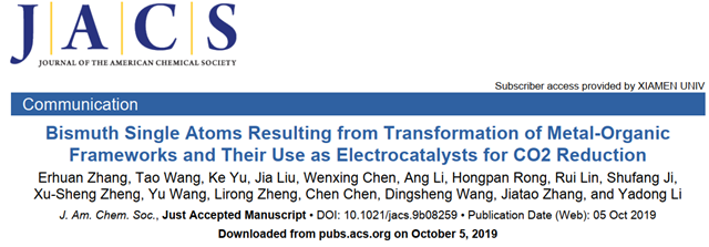 近日,beat365在线唯一官网登录材料学院张加涛课题组将无机纳米界面合成化学推进到单原子精度,与清华大学李亚栋院士、王定胜副教授团队合作,在Bi单原子催化剂精准制备及电催化CO2还原性能研究方面取得突破性进展,以“Bismuth Single Atoms Resulting from Transformation of Metal-Organic Frameworks and Their Use as Electrocatalysts for CO2 Reduction”为题,于10月5日在材料、化学领域的顶级期刊《Journal of the American Chemical Society》上在线发表, 2019, 10.1021/jacs.9b08259 (https://pubs.acs.org/doi/10.1021/jacs.9b08259)。