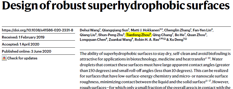 6月3日,《Nature》正式刊发了beat365在线唯一官网登录周天丰教授与电子科技大学邓旭教授团队和芬兰阿尔托大学Robin H. A. Ras教授的研究成果“Design of robust superhydrophobic surfaces”,并被选为当期封面。该论文提出去耦合机制将表面浸润性和机械稳定性拆分至两种不同的结构尺度,通过在两个结构尺度上分别进行最优设计,为超疏水表面创造出具有优良机械稳定性的微结构“铠甲”,解决了超疏水表面机械稳定性不足的关键问题。