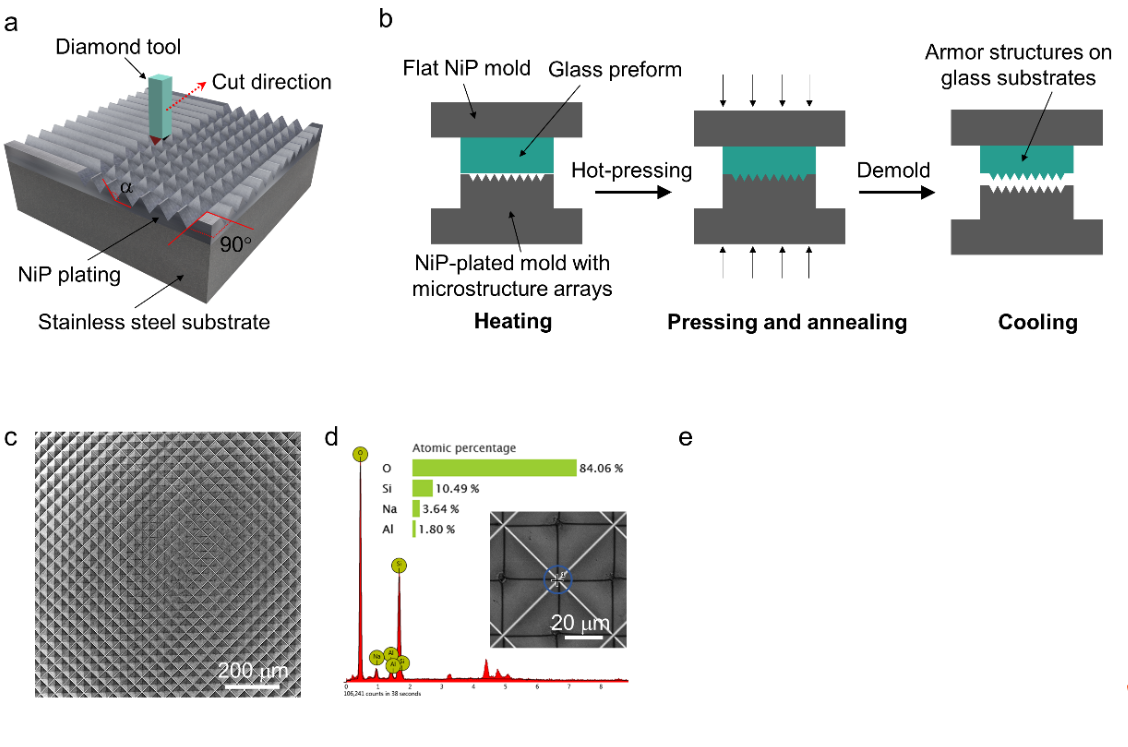 该论文基于全新思路,首次通过去耦合机制将超疏水性和机械稳定性拆分至两种不同的结构尺度,并提出微结构“铠甲”保护超疏水纳米材料免遭摩擦磨损的概念。玻璃铠甲化表面在集成高强度机械稳定性、耐化学腐蚀和热降解、抗高速射流冲击和抗冷凝失效等综合性能的同时,还实现了玻璃铠甲化表面的高透光率,为该表面应用于自清洁车用玻璃、太阳能电池盖板、建筑玻璃幕墙创造了必要条件。beat365在线唯一官网登录发挥其在玻璃微纳结构制造方面的优势,利用玻璃模压成形法实现了倒金字塔阵列微结构的玻璃铠甲制造。该论文创新的设计思路和通用的制造策略展示了铠甲化超疏表面非凡的应用潜力,必将进一步推动超疏水表面进入广泛的实际应用。
