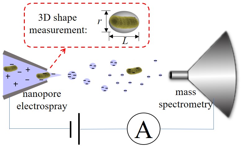 接下来,课题组提出了纳米孔电喷雾离子源的概念与原理,通过测量分子在穿越微米到纳米尺寸的电喷雾喷口时引起的喷雾电流的扰动,目前初步实现了微生物等颗粒的三维几何尺寸测量。该方法与质谱仪器相结合,未来可大幅提高质谱技术的未知物鉴定和三维结构解析能力(Yu Zhang, Yang Tang,… Wei Xu*, ACS Central Science, 2020, 6, 6, 1001–1008)。