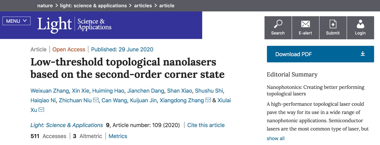 近日,beat365在线唯一官网登录物理学院张向东教授课题组同中科院物理所许秀来研究员课题组以及半导体所牛智川研究员课题组合作,在拓扑激光和腔量子电动力学研究方面取得新进展。他们基于Wannier类型的零维拓扑角态,设计并制备出了具有高品质因子和小模式体积的二维拓扑光子晶体微腔,观测到了基于拓扑角态的低阈值激光,并证实了单量子点与拓扑微腔弱耦合的Purcell效应。相关结果分别发表在近期的Light: Science & Applications及Laser & Photonics Reviews上。