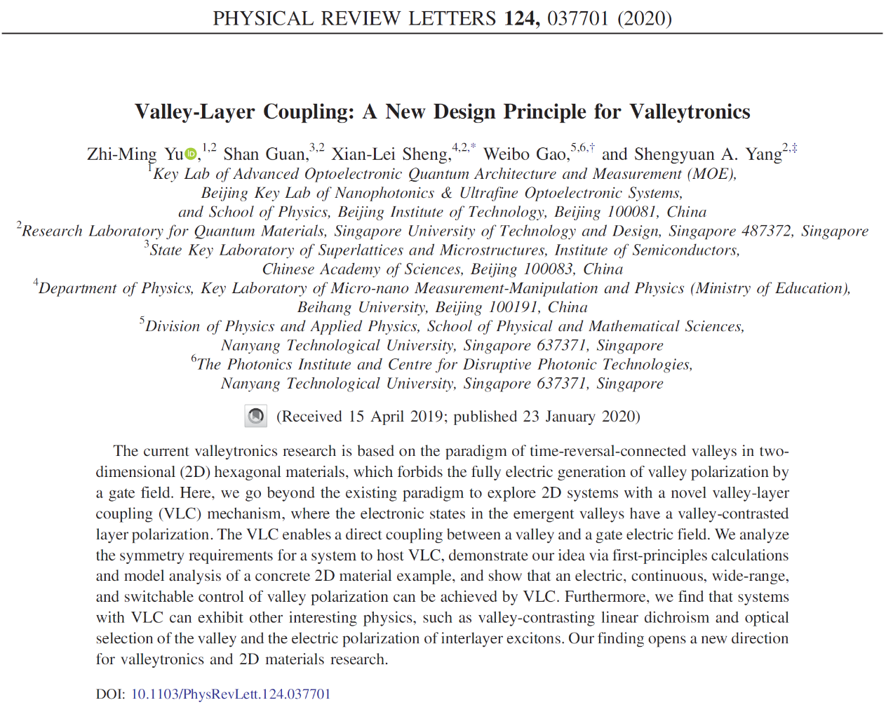 该文章发表于物理学顶级期刊《Physical Review Letters》,作者为余智明、管闪、胜献雷、高炜博和杨声远(Zhi-Ming Yu, Shan Guan, Xian-Lei Sheng, Weibo Gao, and Shengyuan A. Yang),“Valley-Layer Coupling: A New Design Principle for Valleytronics”, Physical Review Letters, 124, 037701 (2020)。
