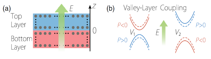图 1:(a)多原子层二维材料可看成由上下两层构成。上层和下层可能含有多个原子层。不同的能谷电子(红色或蓝色)分别局域在上层和下层。(b)当不同能谷电子具有相反的层极化(P)时,施加垂直电场可导致能谷极化。虚线和实线分别表示未加和已加电场时的能带。