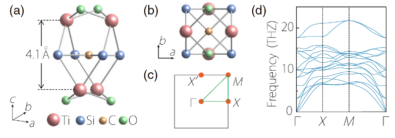 图 2:ML-TSCO 的(a) 侧视图(b)俯视图。(c)ML-TSCO的布里渊区,(d)ML-TSCO的声子谱。