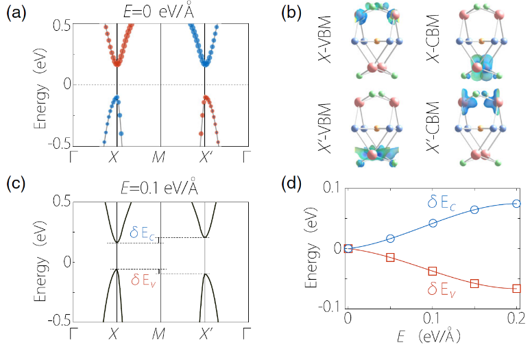 图 3:(a)ML-TSCO的能带图,(b)导带底和价带顶电子的电荷空间分布图,(c)ML-TSCO在施加0.1电子伏每埃的垂直电场后的能带图。此时导带和价带的能量劈裂都已超过室温能标。(d)ML-TSCO的导带劈裂和价带劈裂随电场的变化。