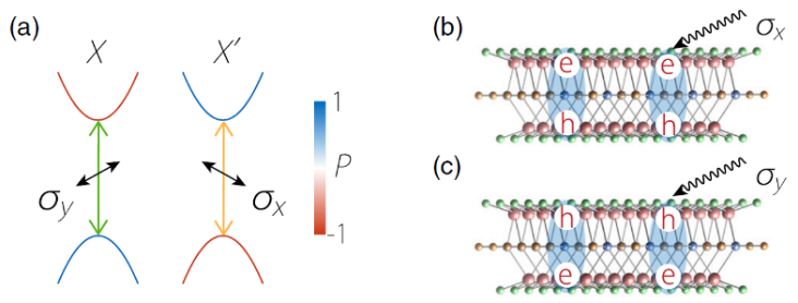 图 4:(a)ML-TSCO的能谷光学选择性。(b,c)x和y线偏光可导致具有相反能谷自由度(X’和X)和相反电偶极矩的层间激子。