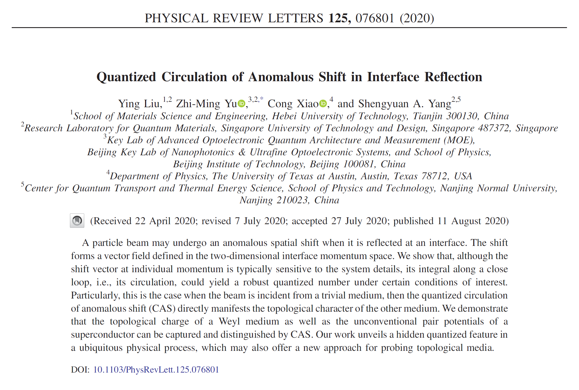 该文章发表于物理学顶级期刊《Physical Review Letters》,作者为刘影、余智明(通讯作者)、肖聪和杨声远(Ying Liu, Zhi-Ming Yu*, Cong Xiao, and Shengyuan A. Yang),Physical Review Letters 125, 076801 (2020)。 文章链接:https://doi.org/10.1103/ PhysRevLett.125.076801