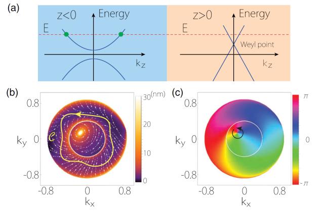 图2:(a)普通金属和外尔半金属所构成的模型示意图。(b)反常位移在界面动量空间的矢量场。箭头代表矢量的方向,颜色代表矢量的绝对值。(c)反射振幅的相位随界面动量的变化。