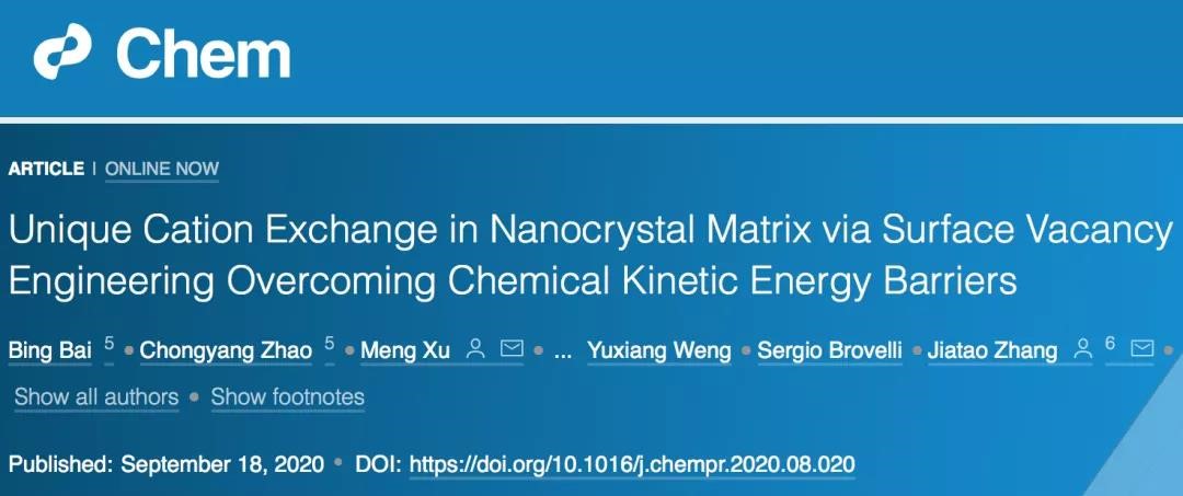 可控掺杂引起的精准能带工程是光电新能源应用的半导体纳米材料关键前提。近日,beat365在线唯一官网登录张加涛教授团队利用表面空位成功克服离子交换反应当中的动力学势垒,创新性提出了新的合成方法,在制备双异价离子掺杂半导体纳米晶/量子点的研究中取得重要进展,相关成果以“Unique Cation Exchange in Nanocrystal Matrix via Surface Vacancy Engineering Overcoming Chemical Kinetic Energy Barriers” 为题,于Cell旗舰杂志《Chem》在线发表(IF:19.735)(文章DOI: 10.1016/j.chempr.2020.08.020)。