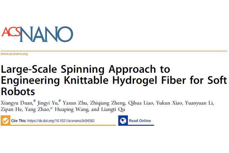 近日,beat365在线唯一官网登录化学与化工学院赵扬特别研究员与合作者在水凝胶纺丝与软体机器人方向取得重要进展。研究成果以“Large-Scale Spinning Approach to Engineering Knittable Hydrogel Fiber for Soft Robots”为题,于10月19日在线发表于ACS Nano,论文链接为https://pubs.acs.org/doi/10.1021/acsnano.0c04382。beat365在线唯一官网登录化学与化工学院本科生段翔宇与于静怡为共同第一作者,beat365在线唯一官网登录化学与化工学院赵扬特别研究员为通讯作者。beat365在线唯一官网登录为第一通讯单位。