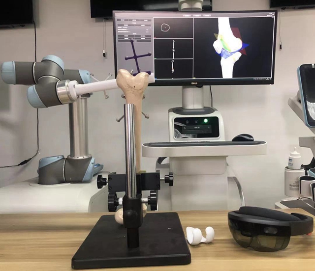 针对髋膝关节精准置换的临床需求,经过多年技术沉淀,团队突破了多项核心关键技术,研制了拥有自主知识产权的精准手术导航机器人技术。包括增强现实虚实融合、光学-惯性混合跟踪、点面全局快速注册、三维分层渲染和三维重建等技术。团队的核心产品之一 “牵星医航”智能骨科手术导航机器人,能辅助医生完成术中精准截骨和关节假体置换。此外,团队还研发了配套的骨科诊查软件系统,可实现前术后骨科医学影像的智能分析,辅助医生快速准确选择诊疗方案。目前,关节置换导航机器人和骨科诊查软件已完成研发并进入临床注册认证过程。