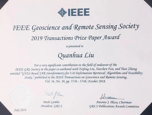 刘飞峰副教授(第一作者)、刘泉华副教授(通讯作者)及其学生范学祯、张天的论文《基于导航卫星的干涉合成孔径雷达三维形变反演:算法与可行性研究》(GNSS-Based SAR Interferometry for 3-D Deformation Retrieval: Algorithms and Feasibility Study),获得IEEE地球科学与遥感协会(GRSS)会刊年度论文奖(TPPA:Transactions Prize Paper Award)。该论文于2018年10月发表在本领域国际顶级期刊《IEEE Transactions on Geoscience and Remote Sensing》(IEEET GRS)上。IEEE TGRS期刊年度论文奖每年评选一次,评选范围为过去一年发表的全部论文,研究工作的原创性、论文表述的清晰度、及时性是主要评选标准,每年度只有一篇论文获奖。这是中国大陆科研机构和学者1991年以来第一次获得此奖项。