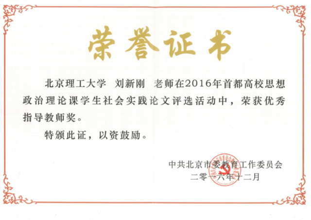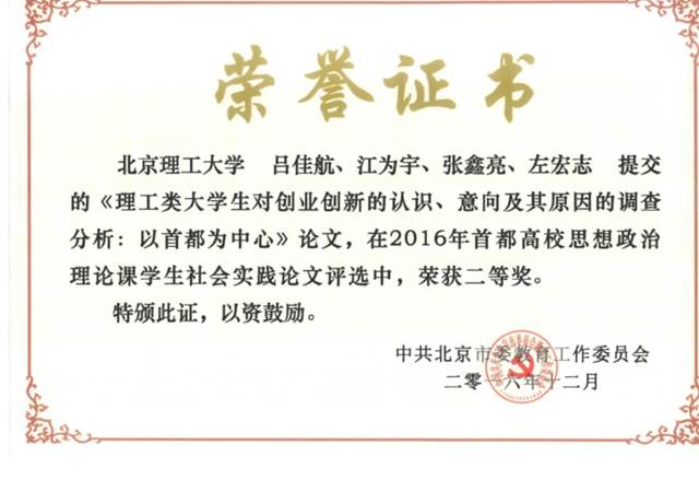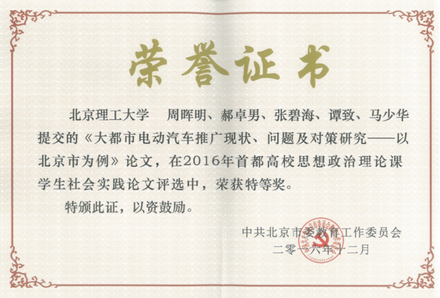 本次活动共收到33所高校提交的157篇学生社会实践论文,经专家评审,北理工刘新刚老师指导,周晖明、郝卓男、张碧海、谭致、马少华等撰写的《大都市电动汽车推广现状、问题及对策研究——以北京市为例》论文获得特等奖(共评出7名特等奖);王娟老师指导,吕佳航、江为宇、张鑫亮、左宏志撰写的《理工类大学生对创业创新的认识、意向及其原因的调查分析:以首都为中心》论文获得二等奖,刘新刚获优秀指导教师奖,北理工荣获优秀组织奖。北京市教工委专门组织了优秀论文表彰及经验交流会。