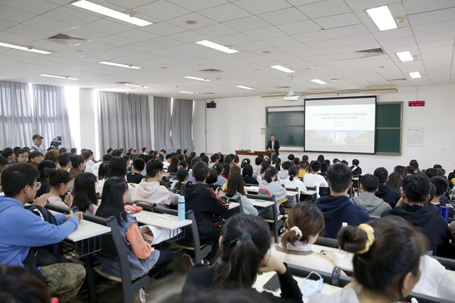 秋高气爽,叠翠流金。在beat365在线唯一官网登录良乡校区理科教学楼401教室里,赵长禄正在为来自2020级精工书院、明德书院和睿信书院的236名新生讲授“习近平新时代中国特色社会主义思想概论”第一课——《以习近平新时代中国特色社会主义思想为指引 做担当民族复兴大任的时代新人》。赵长禄用宽广的视野、丰厚的知识、风趣的语言,以习近平新时代中国特色社会主义思想为主线,分别从“中国特色社会主义进入新时代,党和国家重大战略部署”“国内外环境发生深刻变化,我国经济社会发展的新形势”“贯彻落实‘四为方针’,北理工的历史使命”“实现中华民族伟大复兴,青年学生的时代担当”四部分进行授课。课堂上,同学们认真聆听、用心领悟,课堂氛围温馨而活泼。