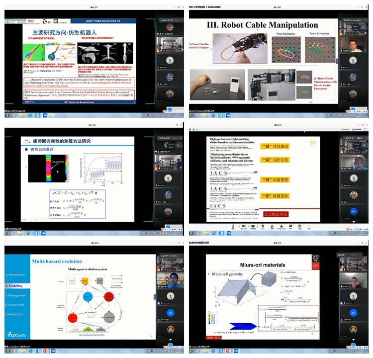 学术交流汇报环节,来自斯坦福大学、麻省理工学院、南加州大学、东京大学、代尔夫特理工大学、科罗拉多大学博尔德分校、南洋理工大学、悉尼科技大学、英国诺丁汉大学、荷兰埃因霍温理工大学、华盛顿州立大学、清华大学、哈尔滨工业大学等的18位海外青年学者通过视频会议的形式,和与会人员交流和探讨了各自研究领域的研究进展和前沿问题。学院老师针对青年学者的报告内容与其进行了热烈讨论。