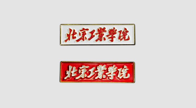 在徽章套件中,首先是两枚“北京工业学院”的长方形校名牌,校名由苍劲有力的毛体字书写,白底红字和红底白字两款,当时分别发放学生与教师佩戴。1952年,学校更名为北京工业学院,并成为新中国第一所国防工业院校,在胸前佩戴“京工”校名牌是每位师生最自豪的荣光,辉煌的“京工岁月”融入小小的徽章之中。
