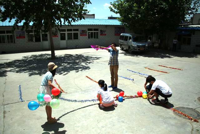 上午十一点,顶着炎炎烈日,负责现场布置的志愿者已经到位开始了会场的前期准备工作,而此时此刻孩子们正在午睡,为了不影响孩子们休息并且不耽误联欢会开场时间,绿风志愿者们尽量控制避免产生噪音,紧张而有序地开始布置会场。汗水挥洒在炙热的水泥地板上,志愿者们不去理会天气的炎热和身体的疲惫,因为他们累在身上,乐在心中。