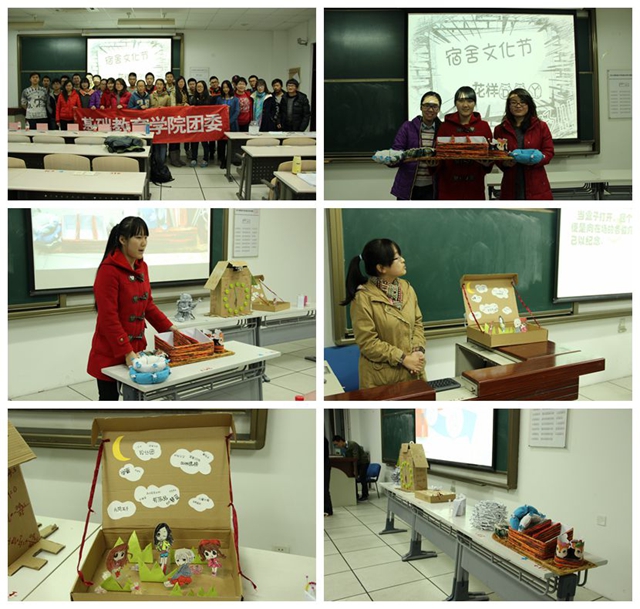 此次宿舍文化节的主题是:乐成一家,We are together,活动共包括“情谊飞长,青春由我” ----宿舍展示大赛,“炫我挑战,挥剑争锋” ---寝室吉尼斯 ,“创意灵动,型秀自由” ---花样DIY,“精彩点滴,和韵生活”---“在北理,我想说”四个部分,活动从11月2日报名开始至12月7日为止,历时一个多月,参与报名宿舍多达100个,其中仅基础教育学院报名参与宿舍85个,占整个活动宿舍比例的85%。宿舍展示大赛从宿舍文明方面入手,主要包括寝室的口号、寝室美化的照片、视频及宿舍集体生活照等从多方面展示学生宿舍风貌。寝室吉尼斯则是要求以宿舍为单位来申报你认为的宿舍之最,如宿舍四人上一学年或学期获得各种奖学金总和最多的男生和女生寝室,身高总和最大及最小的男生和女生寝室等。花样DIY则是从低碳环保、团结、创新的角度入手,共分两次活动开展,第一次活动由组织方为参赛选手提供材料(平时喝水用的废旧纸杯、普通大头针),并在专业老师的指导下,教选手们制作精美的手工艺品,选手们热情高涨,认真学习着每个步骤,然后由评委根据作品选出入围寝室;第二次活动则由参赛选手根据比赛要求,利用自己宿舍的废旧物品进行制作并进行现场展示和答辩;在随后的现场答辩环节,很多同学表示此次宿舍文化节不仅给了他们一个展示自己宿舍文化的良好平台,更增进了舍友之间的感情,他们为了完成一件作品,宿舍四人集体合作,可能会因其中某个环节的问题争论的面红耳赤,但最终还是在集体智慧下将问题解决的那份欣喜是那样的难能可贵。最终静C305宿舍在此次“花样DIY”中夺得桂冠,他们制作的是一个适合宿舍使用的综合收纳,作品美观且实用性强,由于作品都是利用废旧毛巾和纸壳制作而成、不具有防水性,他们经过共同努力解决此项技术难题,将收纳盒底部粘上废旧的光盘,这样既坚固耐用又美观大方;另外一个名叫“小苹果奇缘”的作品,给评委们留下了深刻的印象,这个作品是以宿舍四人的卡通形象为素材,利用平时收快递的废旧纸盒,将每个人的性格特征通过作品展现出来,此作品取名为“小苹果奇缘”,旨在道出“在这个小苹果泛滥的年代,都希望我们能找到属于自己的老菠萝”。 在北理,我想说,则是给同学们一个展示内心世界的机会,以个人为单位,诉说自己的内心想法,可以将你想说的话通过三行诗、微博体等各种形式表达出来,诉说的对象可以是宿舍室友、宿舍楼管阿姨或者班级同学、老师等,同学们都积极踊跃参加,将自己的想法表达了出来,获得了预期的效果。
