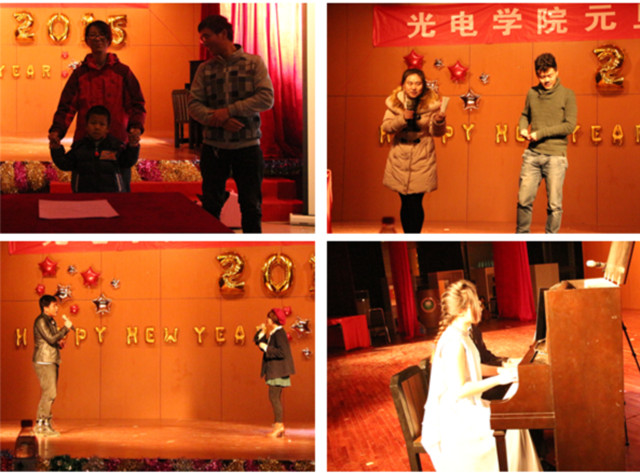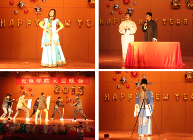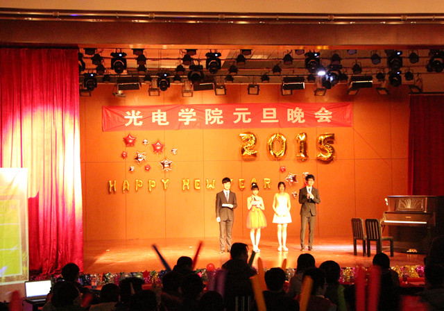 流光溢彩,辞旧迎新。12月31日,光电学院2015年元旦晚会在新食堂四层文化艺术剧场精彩上演。学院师生们齐聚一堂,在欢声笑语中共同迎接新年的到来。欢快的音乐,温馨的话语,老师们的祝福,同学们的祈盼,一段幽默诙谐的开场视频拉开晚会序幕。学院党委书记郝群致辞,向老师和同学们送上了新年祝福。