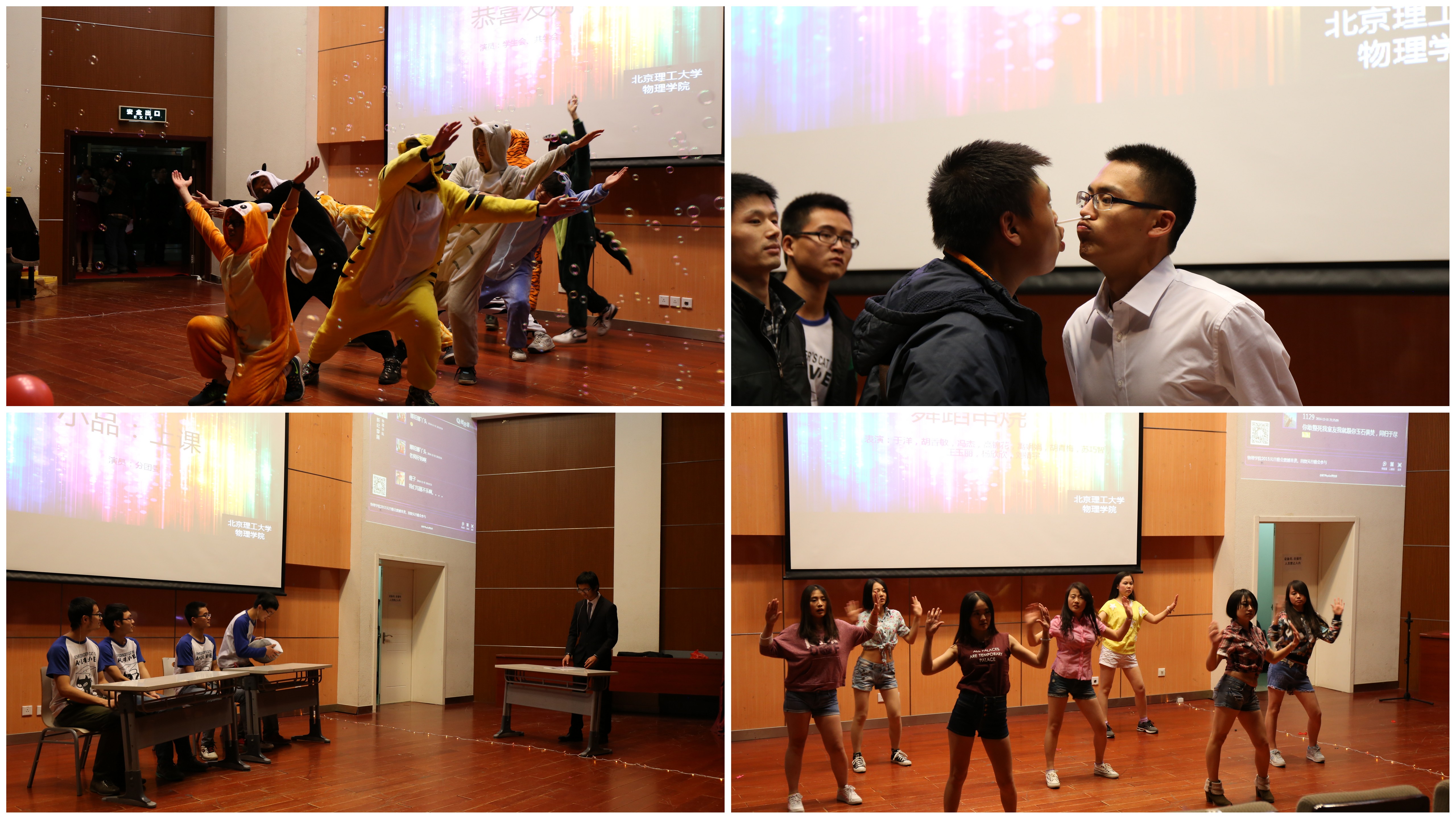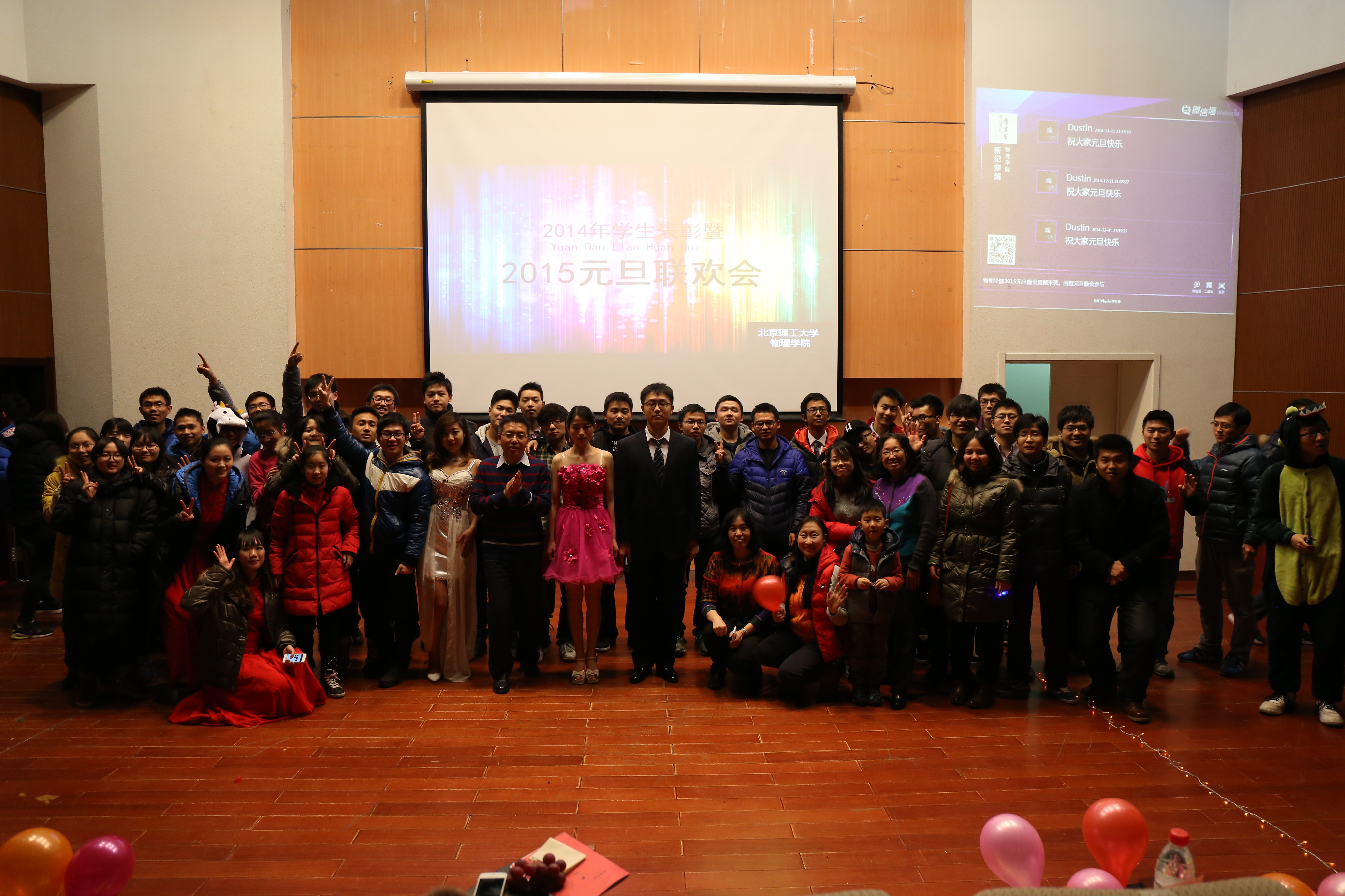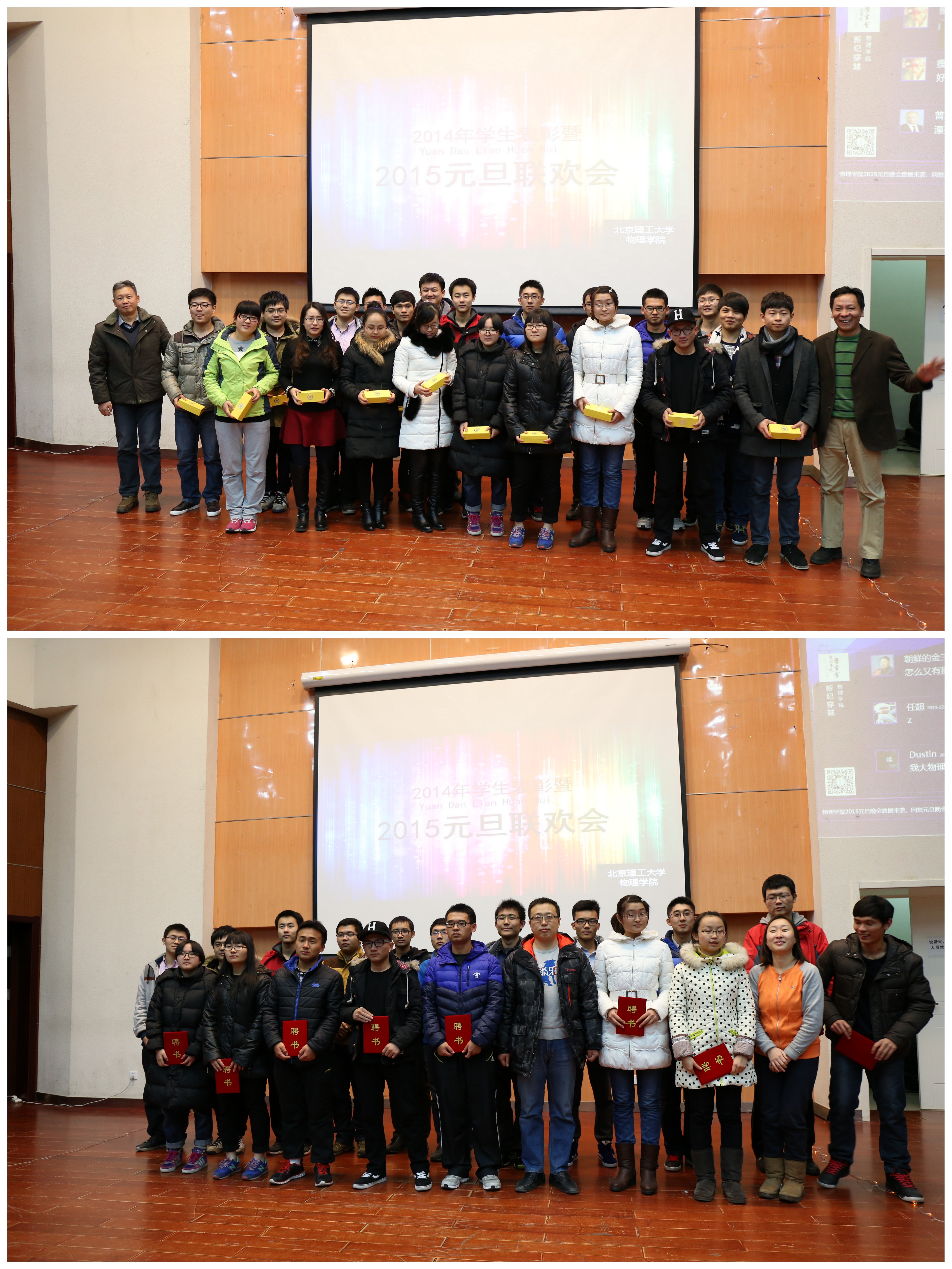 晚会于18时50分开始,首先进行的是颁奖典礼,对2014年物理学院各类获奖学生进行表彰同时对物理学院学习辅导大队成员颁发聘书。最后获奖成员与颁奖老师在台前合影留念以资鼓励。随后,现场大屏幕上播放了由物理学院老师及学生干部送上的新年祝福,温情中不乏欢笑,其乐融融。