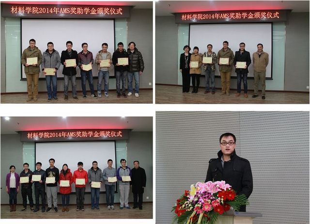 首先,颁发的是材料学院2014年度AMS奖助学金。佛山先进机械设备有限公司(AMS)作为国内从事表面工程技术的知名企业,事业蓬勃发展的同时不忘心系教育事业,从2005年期连续十年在材料学院设立奖助学金,每年捐赠五万元,累计捐赠五十万元,300余名学生得到奖励和资助。