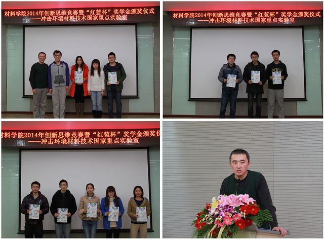 接下来,颁发了材料学院2014年度冲击材料环境技术国家重点实验室创新思维竞赛奖。此项竞赛是由材料学院冲击材料环境技术国家重点实验室主办,鼓励和支持广大研究生、本科生同学了解和掌握材料科技前沿动态,锻炼和增强个人科研素养和综合素质,激发同学们的创新思维和拔尖意识,同时发挥重点实验室高水平人才培养能力,引导同学们根据个人兴趣和灵感,在重点实验室开放式平台上开展科研创新工作。