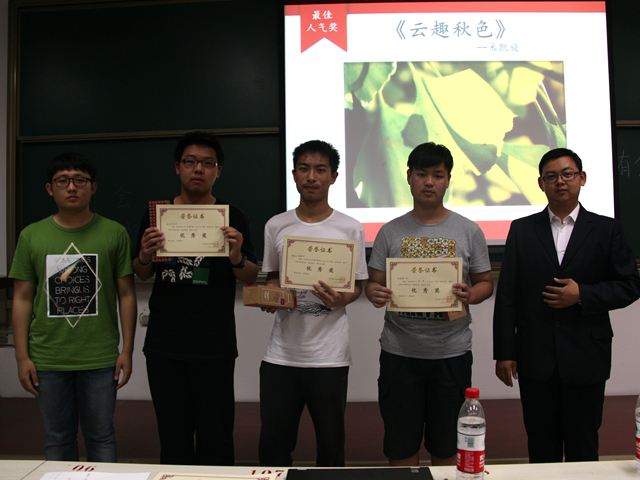 接着,“生命之家”宣传部部长曹铭铭宣布了在“生命之美”摄影比赛中取得优异成果的同学们。并展示了他们优秀的作品,由刘惠康老师为获奖作者颁发奖状和奖品。随后,由刘惠康老师致辞,对“生命之美——生命科学文化月”系列活动做了总结,并对本次活动取得的成果给予肯定,对每一位参与活动的同学给予认同。他还鼓励同学们多参与到类似的活动中去,在活动中不断的提高自己综合能力。
