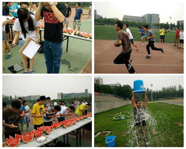 7月5日上午举行了“西瓜碰碰凉”活动。活动包括猜猜我多重、西瓜大搬运和终极吃西瓜三个环节。活动分为个人赛和小组赛两种形式。在以宿舍为单位的西瓜大搬运活动中,西瓜化身接力棒在每个宿舍成员之间传递。尽管西瓜的重量减慢了同学的脚步,甚至有的人在奔跑过程中摔倒,但默契的配合、争先的脚步以及团结的精神却与现场的欢声笑语相融合,打动了在场的每一个人。在终极吃西瓜环节中,参赛选手在规定的时间内吃西瓜,以体重增加的多少来判断成绩。比赛过程中,很多同学克服羞涩的心理,在众人面前,以最快的速度吃掉最多的西瓜,在炎炎夏日中,给身体带来丝丝清凉。最后。每个比赛均有一名同学接受冰桶挑战,他们在大家的加油助威声中,感受的冰桶的刺激和挑战。