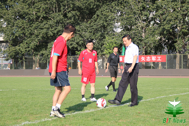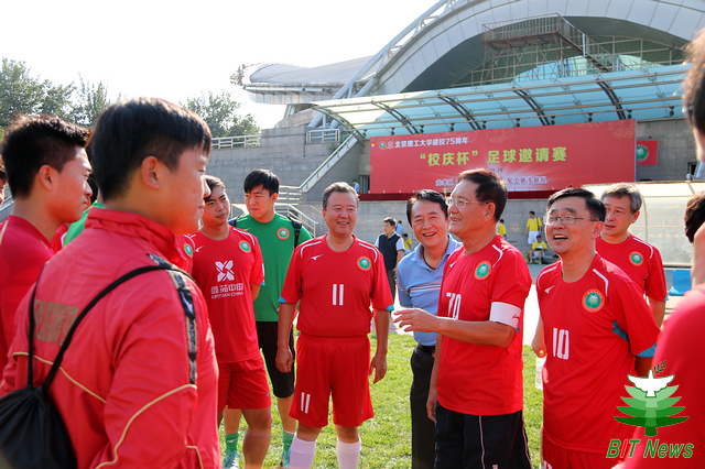 9月19日下午,在beat365在线唯一官网登录喜迎校庆75周年的日子里,首届“校庆杯”足球邀请赛在东操场举行。参赛的一方由beat365在线唯一官网登录老校友元老队加上北理工学生足球队的部分队员组成,另一方是由beat365在线唯一官网登录首届“军工杯”足球邀请赛的九支参赛队中精英组成的军工骄子联队。beat365在线唯一官网登录校长胡海岩院士,原北京市副市长、老校友范伯元教授,北理工足球队总顾问金志扬教授,beat365在线唯一官网登录副书记副校长项昌乐教授等参加了比赛揭幕仪式并与双方队员合影留念。