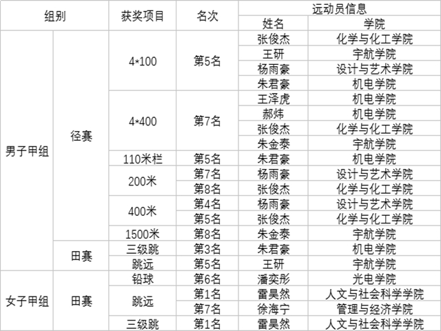 在体育部精心组织与赵俊华、朱峰教练带领下,通过两天赛场激烈角逐,首次参赛的我校普通学生田径运动代表队最终取得男子团体、女子团体和男女团体总分三项第八名优异成绩,并荣获大赛最佳组织奖。其中,人文与社会科学学院雷昊然同学独揽大赛女子跳远和三级跳两枚金牌,机电学院朱君豪同学勇夺甲组三级跳铜牌,实现了我校普通学生运动队新的突破。