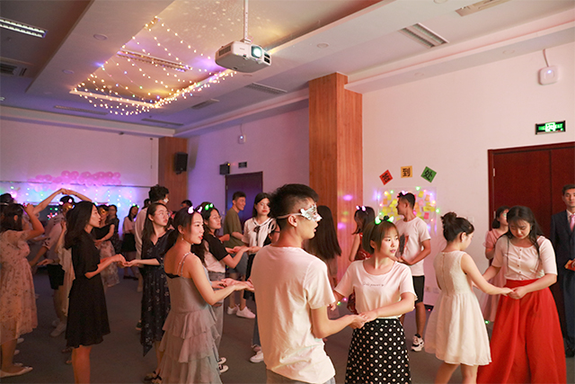 舞会的开场由郑阳和盛雨桐两位同学分别带来歌曲《再不疯狂我们就老了》和《明天,你好》,让大家在美妙的歌声中迅速进入舞会气氛。之后是吴鹏、李淑宁两位同学带来精彩的舞蹈表演,惊艳的技艺、优美的舞步令现场掌声不断。经过自由搭配舞伴和舞蹈老师的耐心教学,同学们和舞伴愈加默契,舞步也熟练起来,大家跟着音乐欢快的舞动起来。中间穿插的抽奖环节以及“123看这边”“一块五”的小游戏使现场气氛达到高潮。最后由张峻豪同学带来歌曲《那些年》,让大家在青春的歌声中结束今晚精彩的舞会。
