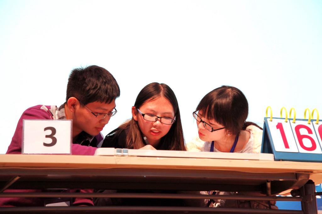 第三轮比赛为“争分夺秒”抢答环节,各大团队都蓄势待发,积极抢答,因此出现了多次超前抢答的情况。我校选手也不甘示弱,十分敏捷,获得了三次抢答机会,由于抢答第二题时我校选手在准备过程中出现了小失误,导致答案记忆错误,因而失去这一题的得分。虽然出现了小小的失误,选手们也丝毫不气馁,他们互相打气,再接再厉,没有让这一失误影响之后的比赛。