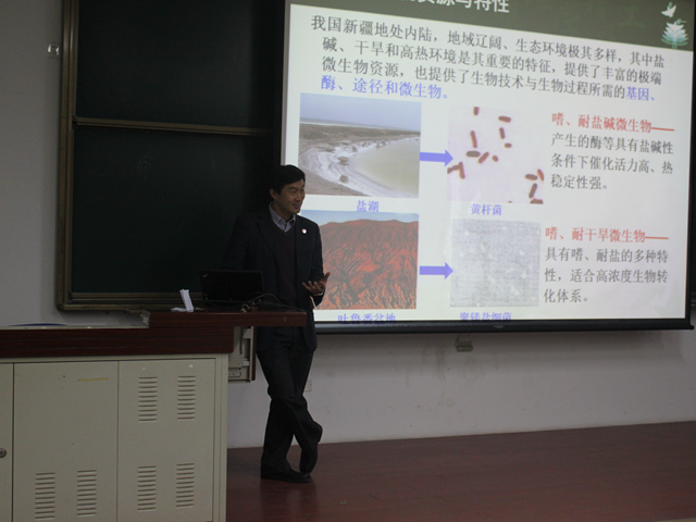 随后,李春教授向大家说明极端微生物资源与特性,以新疆某些极端环境微生物为切入点,介绍了极端微生物的主要类型以及它们各自的特性,而这些特性是挖掘新基因非常好的渠道。同学们听得十分认真,纷纷边听边详细地做好笔记。关于如何应用这些资源来促进科学技术的发展,李教授从三个层面提出了自己的看法:其一,是基于酶层面的催化转化。其中包含磷脂酶实现植物油高效脱胶、甘油脱水酶实现甘油快速转化及葡糖醛酸苷酶实现甘草酸定向生物转化。其二,是基于细胞层面上的代谢转化。其中包括基因元件的挖掘与表征、耐热底盘宿主、酵母细胞内合成木糖醇的途径构建与优化及甘草酸前体的生物合成。其三,是基于种群层面上的协同转化。在讲解这三个方面时,李教授详略得当,语言幽默风趣,使原本严肃端正的学术性讲座气氛活跃了许多。